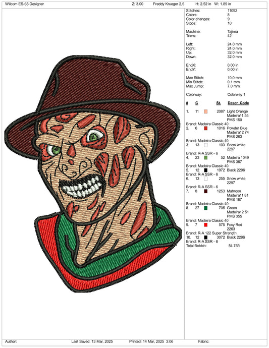 Freddy Krueger Face Embroidery Files - 3 Size's
