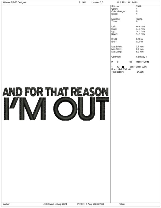 And For That Reason I'm Out Embroidery Files - 3 Size's
