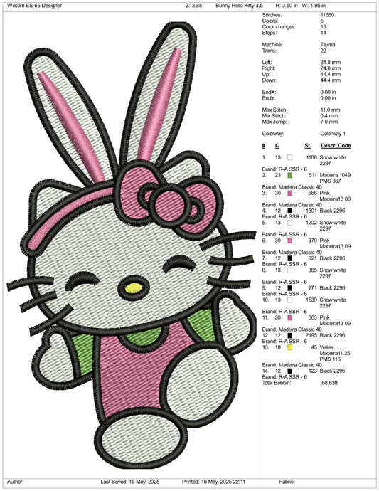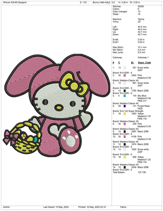 Hello Kitty Easter Bunny Embroidery Design Files - 3 Size's