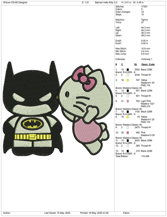 Hello Kitty Kiss Batman Embroidery Design Files - 3 Size's