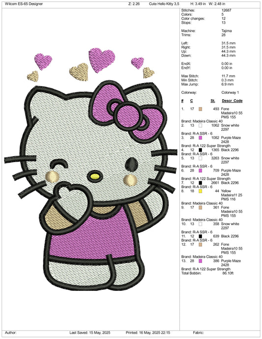 Hello Kitty Love Embroidery Design Files - 3 Size's