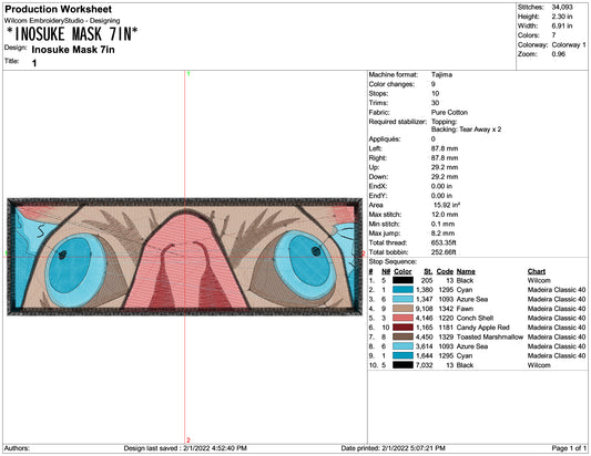 Inosuke Hashibira Mask Embroidery Design Files - 3 Size's