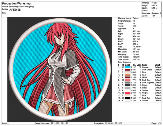 Rias Gremory Embroidery Design Files - 5 Sizes