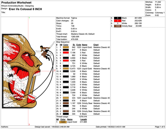 Eren Vs Colossal Embroidery Design Files - 5 Size's