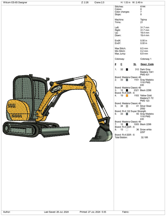 Excavator Embroidery Design Files - 3 Size's