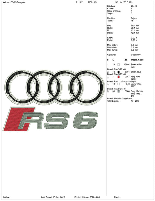 Audi RS6 Logo Embroidery Design Files - 4 Size's