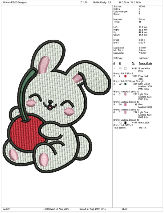 Bunny Cherry Embroidery Design Files - 3 Size's