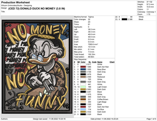 No Money No Funny Donald Duck Embroidery Design Files - 4 Sizes