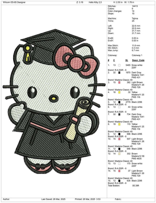 Hello Kitty Graduation Embroidery Design Files - 3 Size's