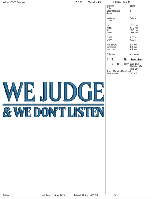 We Judge & We Don't Listen Embroidery Design Files - 3 Size's