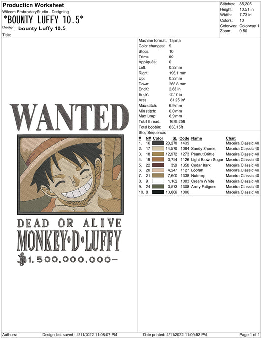 Wanted Bounty Luffy Embroidery Design Files - 1 Size
