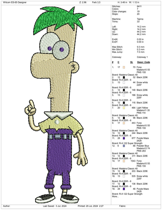 Ferb Fletcher Embroidery Design Files - 3 Size's