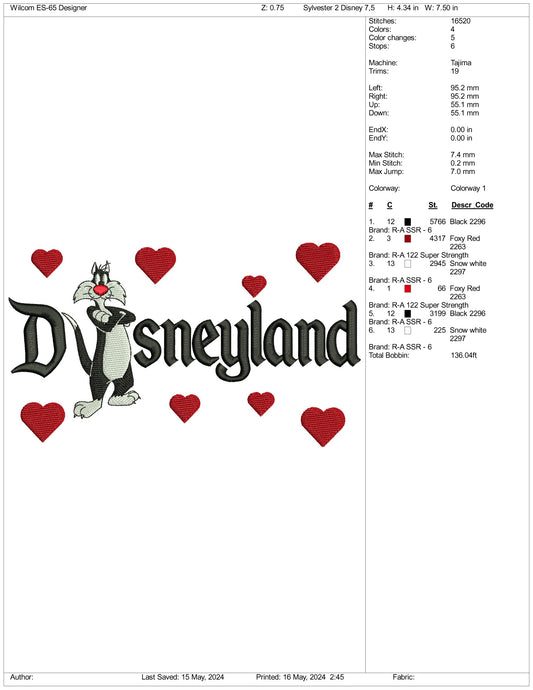 Sylvester Disneyland Embroidery Design Files - 3 Size's