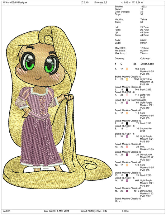 Rapunzel v1 Embroidery Design Files - 3 Sizes