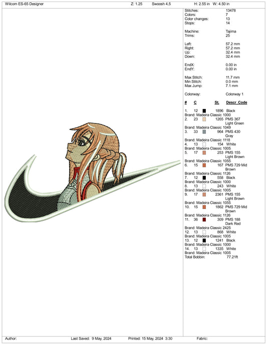 Yuuki Asuna Swoosh Embroidery Design Files - 3 Sizes