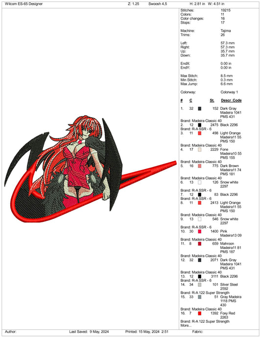 Rias Gremory Swoosh Embroidery Design Files - 3 Sizes