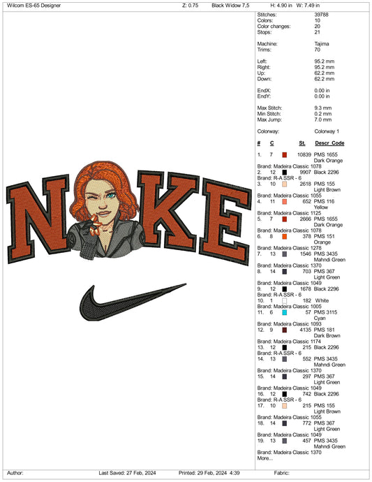 Nike Black Widow Embroidery Design Files - 3 Size's