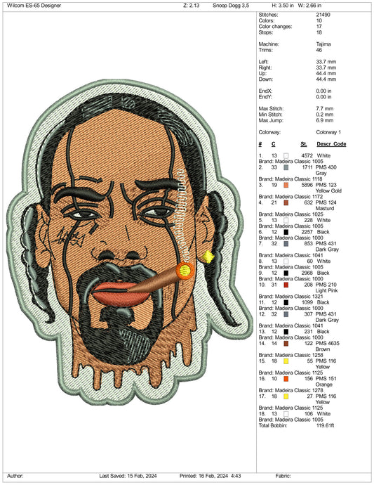 Snoop Dogg Face Embroidery Design Files - 3 Size's