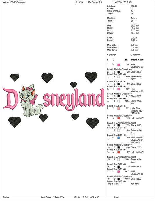 Marie Cat Disneyland Embroidery Design Files - 3 Size's