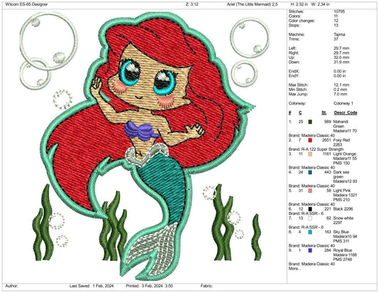 Chibi Ariel Embroidery Design Files - 3 Size's