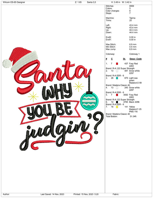 Santa Why You Be Judgin Embroidery Design Files - 3 Size'sRegular price $6.99 USDRegular priceUnit price / per-