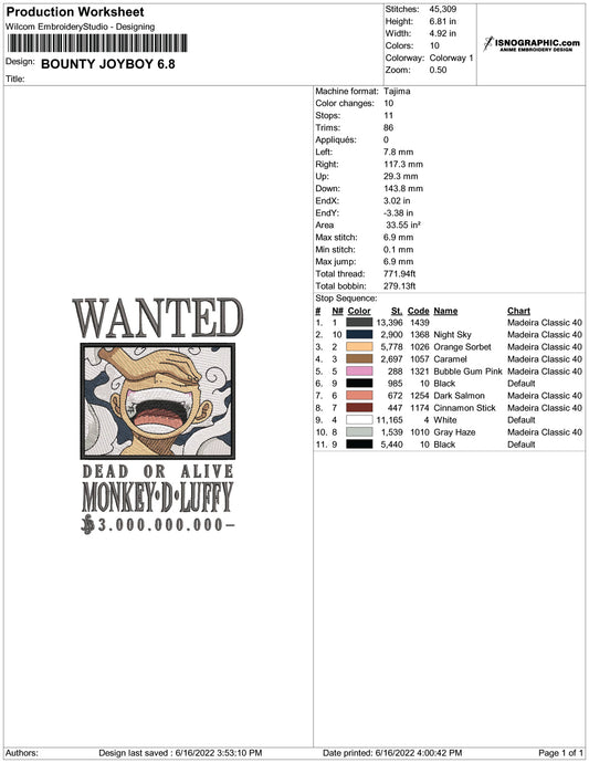 Bounty JoyboyEmbroidery Design Files - 6 Size's