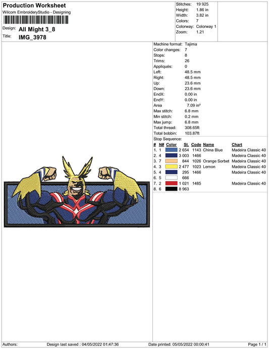 All Might v2 Embroidery Design Files - 3 Size's