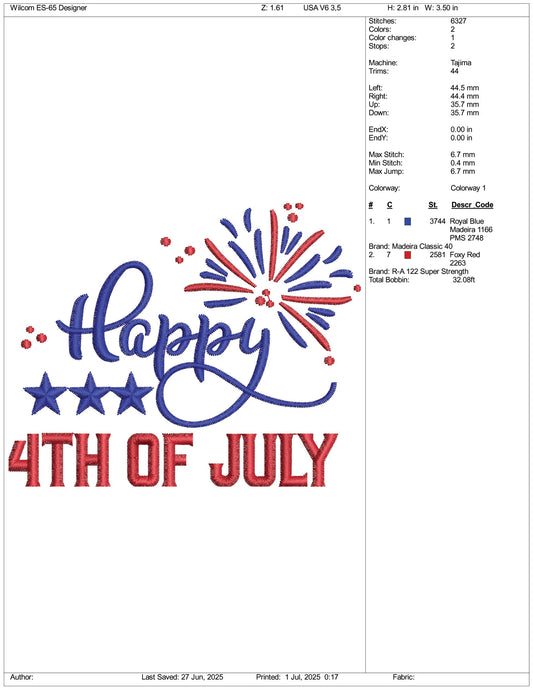 Happy 4th of July v2 Embroidery Design Files - 3 Size's
