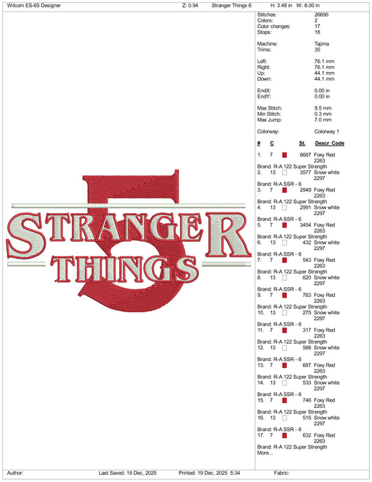 Stranger Things 5 Embroidery Design Files - 3 Size's