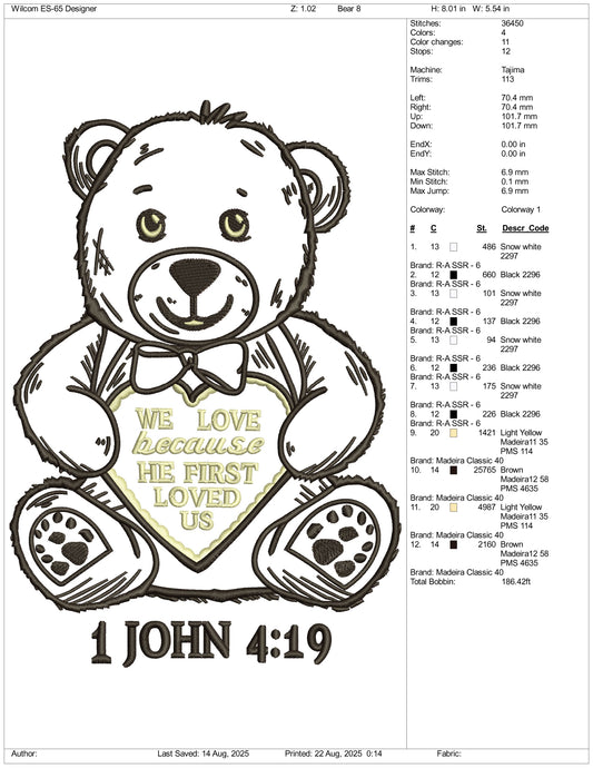 1 John 4:19 Bear Applique Embroidery Design Files - 4 Size's