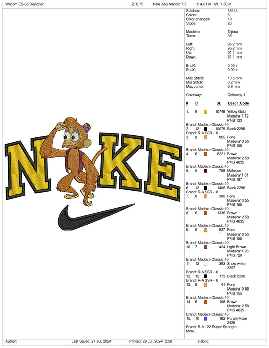 Archivos de diseño de bordado de Nike Aladdin Abu (3 tamaños)