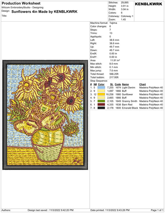 Sunflowers After Van Gogh Embroidery Design Files - 2 Size's