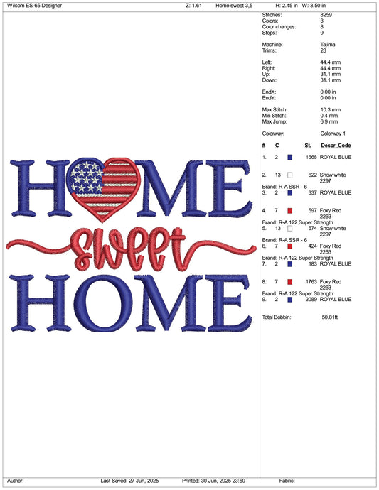 USA Home Sweet Home Embroidery Design Files - 3 Size's