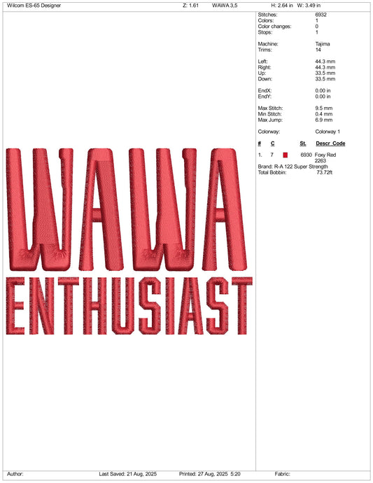 Wawa Enthusiast Embroidery Design Files - 2 Size's
