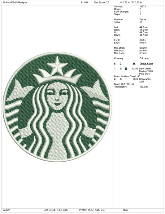 Starbucks Logo Embroidery Design Files - 3 Size's