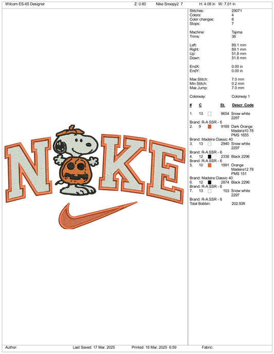 Archivos de bordado de calabaza de Snoopy de Nike (3 tamaños)