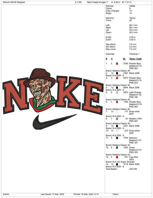 Archivos de bordado de cara de Freddy Krueger de Nike (3 tamaños)
