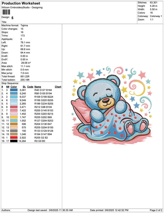 Teddy Bear Sleeping Embroidery Design Files - 7 Size's