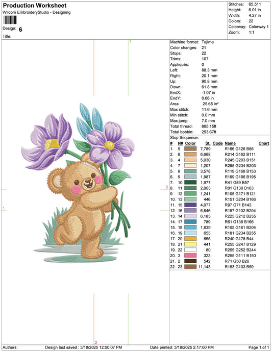 Teddy Bear with Flowers Embroidery Design Files - 7 Size's