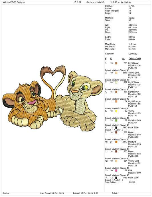 Archivos de diseño de bordado de Simba y Nala - 3 tamaños