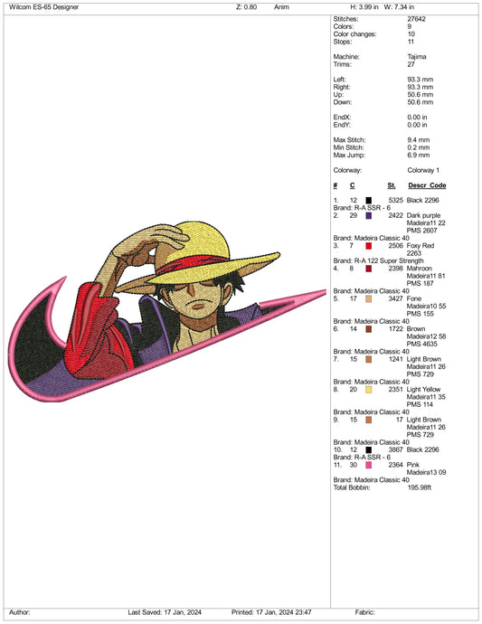 Archivos de diseño de bordado de Nike con Monkey D. Luffy (3 tamaños)