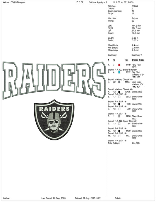 Raiders Embroidery Design Files - 3 Size's