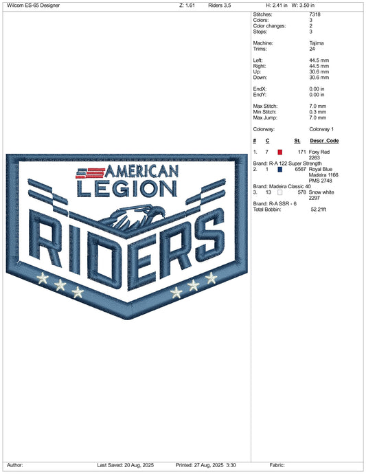 American Legion Riders Embroidery Design Files - 3 Size's