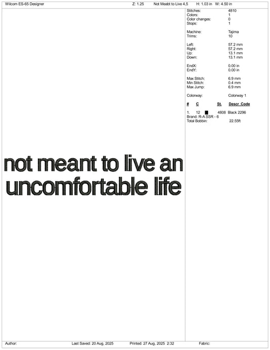 NOt Mean To Live an Uncomfortable Life Embroidery Design Files - 3 Size's