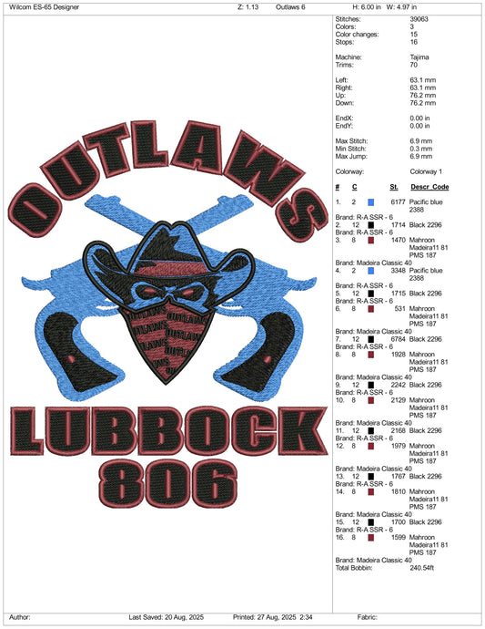 Outlaws Lubbock 806 Embroidery Design Files - 3 Size's