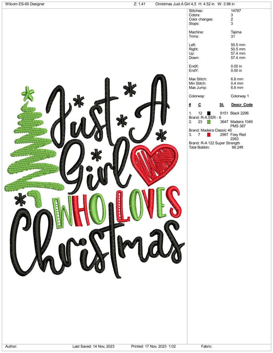 Archivos de diseño de bordado "Just A Girl Who Loves Christmas" (3 tamaños)