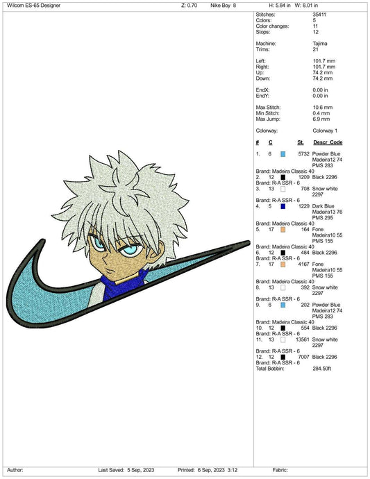 Archivos de diseño de bordado Nike Killua Zoldyck (3 tamaños)