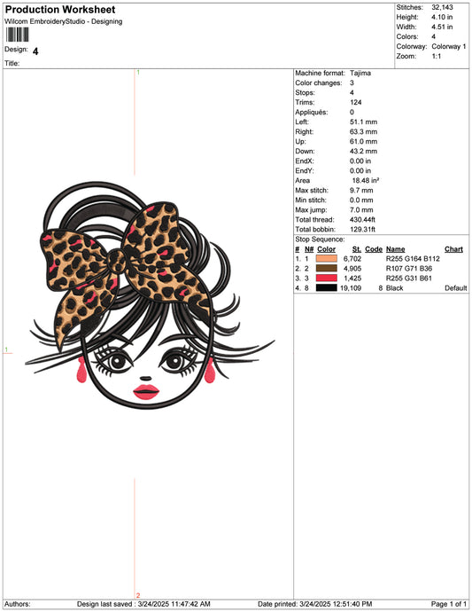 Girl with Leopard Bow Embroidery Design Files - 9 Size's