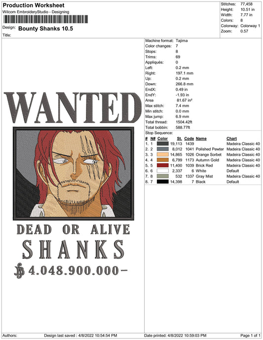 Bounty Wanted Shanks Embroidery Design Files - 6 Size's