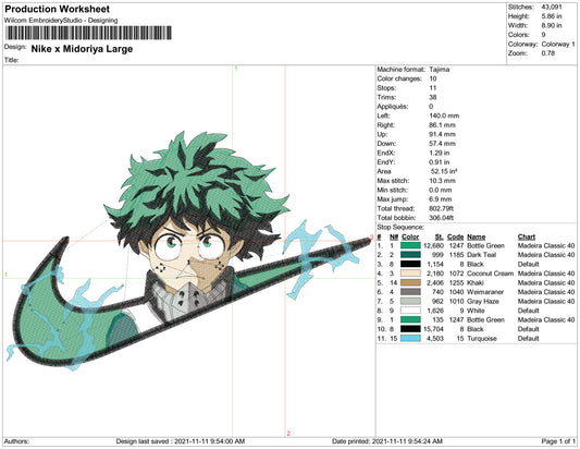 Izuku Midoriya Swoosh v5 Embroidery Design Files - 3 Size's